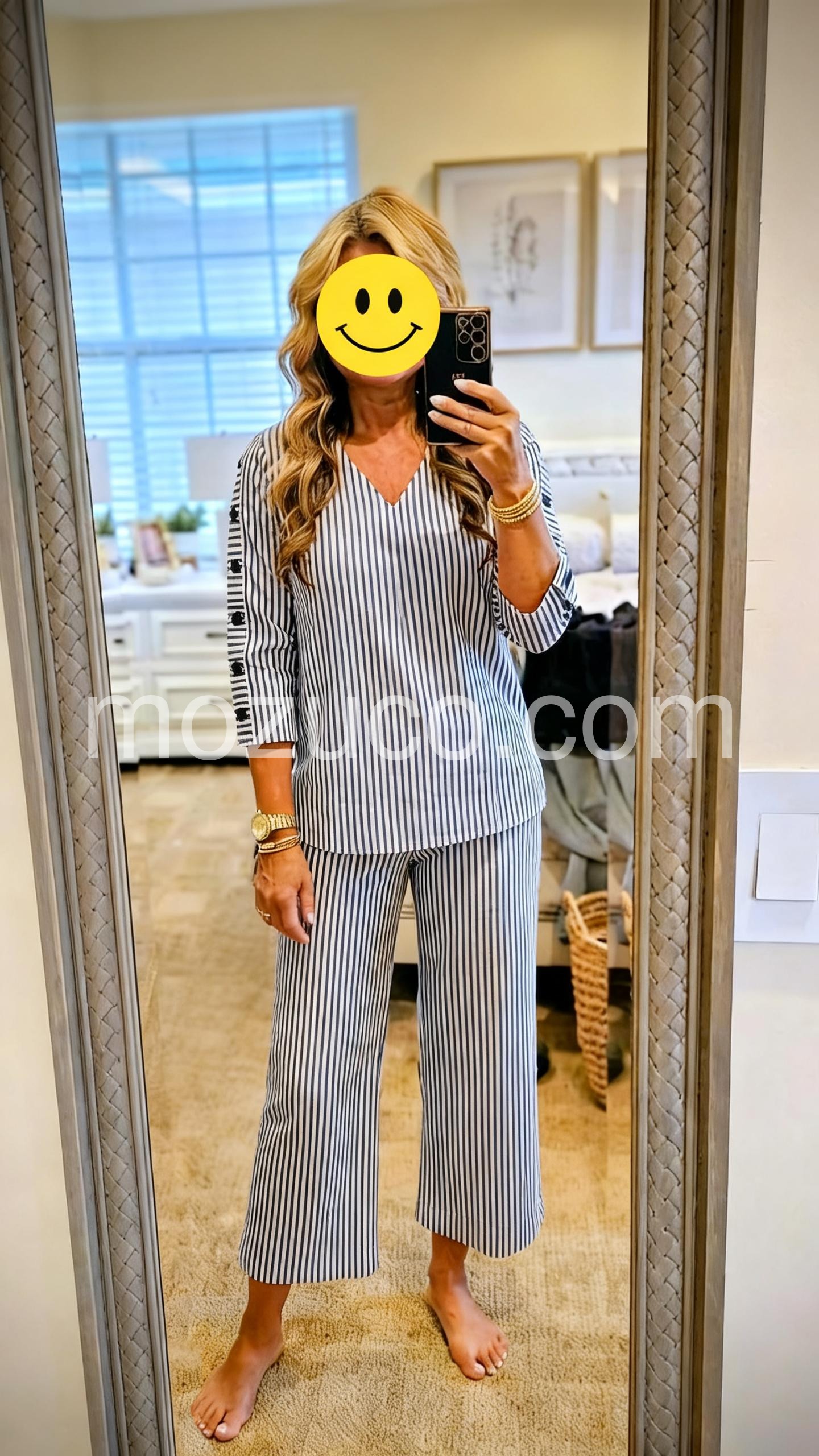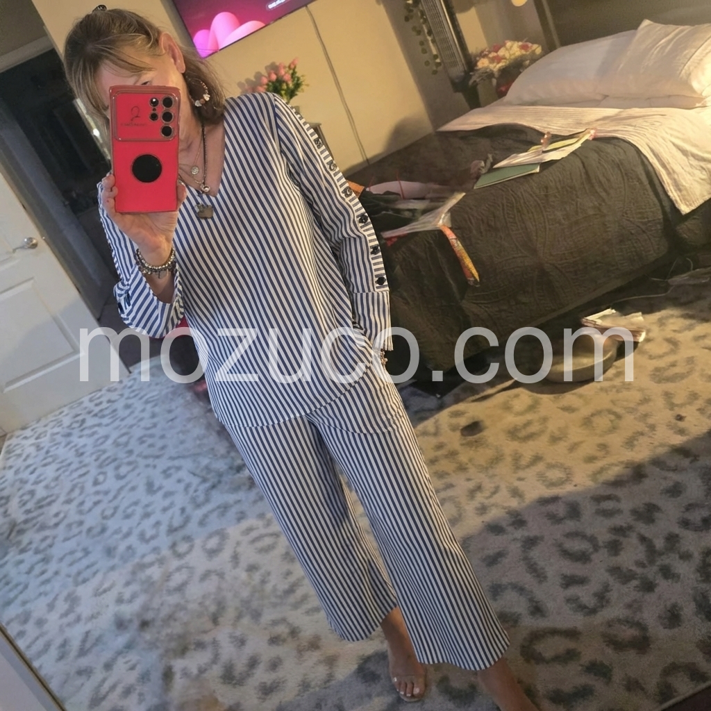 This coordinated set features a relaxed V-neck top and wide-leg cropped pants in classic blue and white stripes. The long sleeves with decorative side buttons add a stylish detail. Lightweight fabric perfect for warm weather. Ideal for casual outings or smart-casual events. Effortlessly elegant and easy to wear.