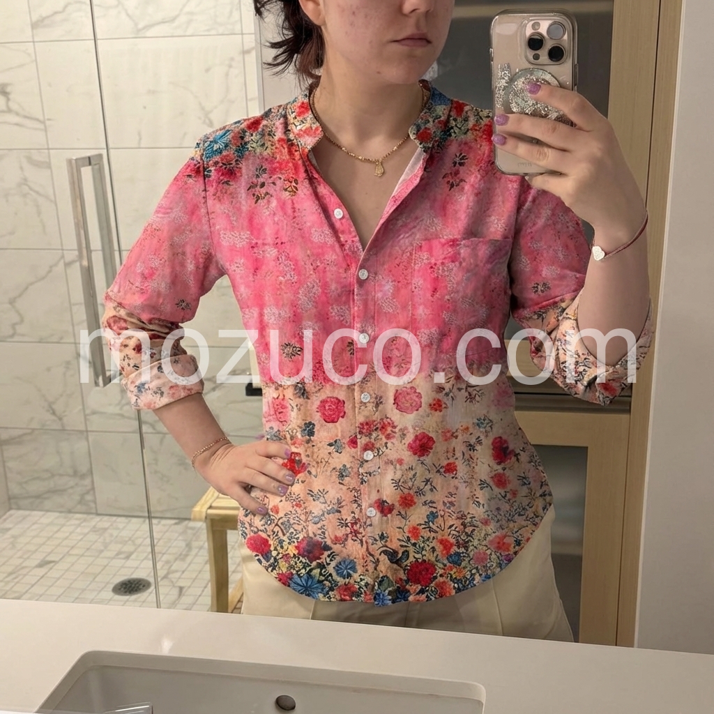 Beautiful blouse. The gradient effect makes it unique compared to standard floral shirts. It is my new go-to top for spring.