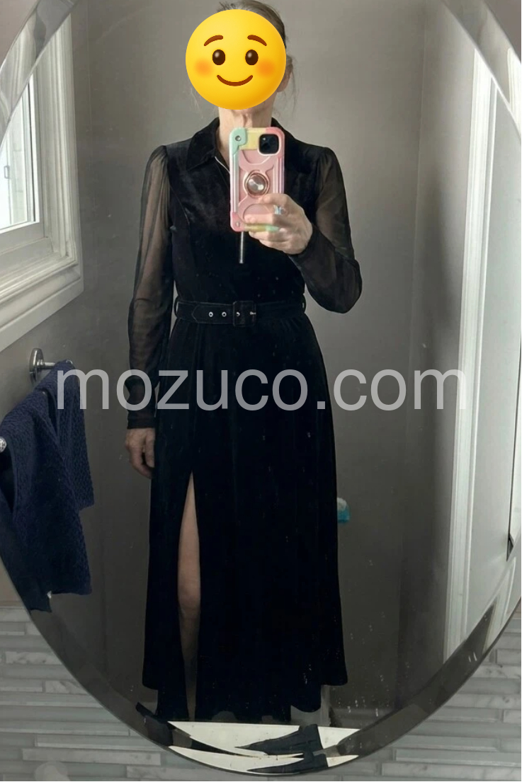 This is a beautiful black maxi dress. The zip neckline and the waist belt create such a flattering shape, and the length is perfect with boots. It feels comfortable while still looking very polished and elegant. I wore it on a cruise and got compliments right away.