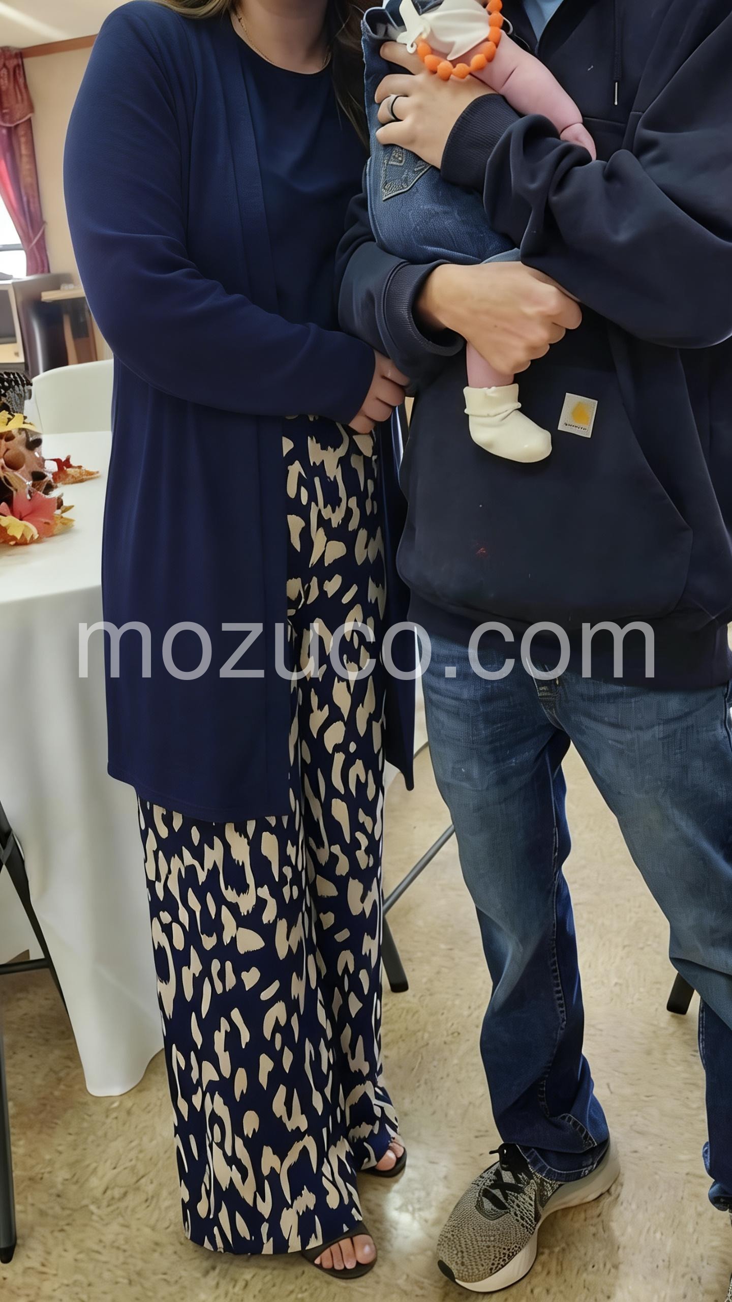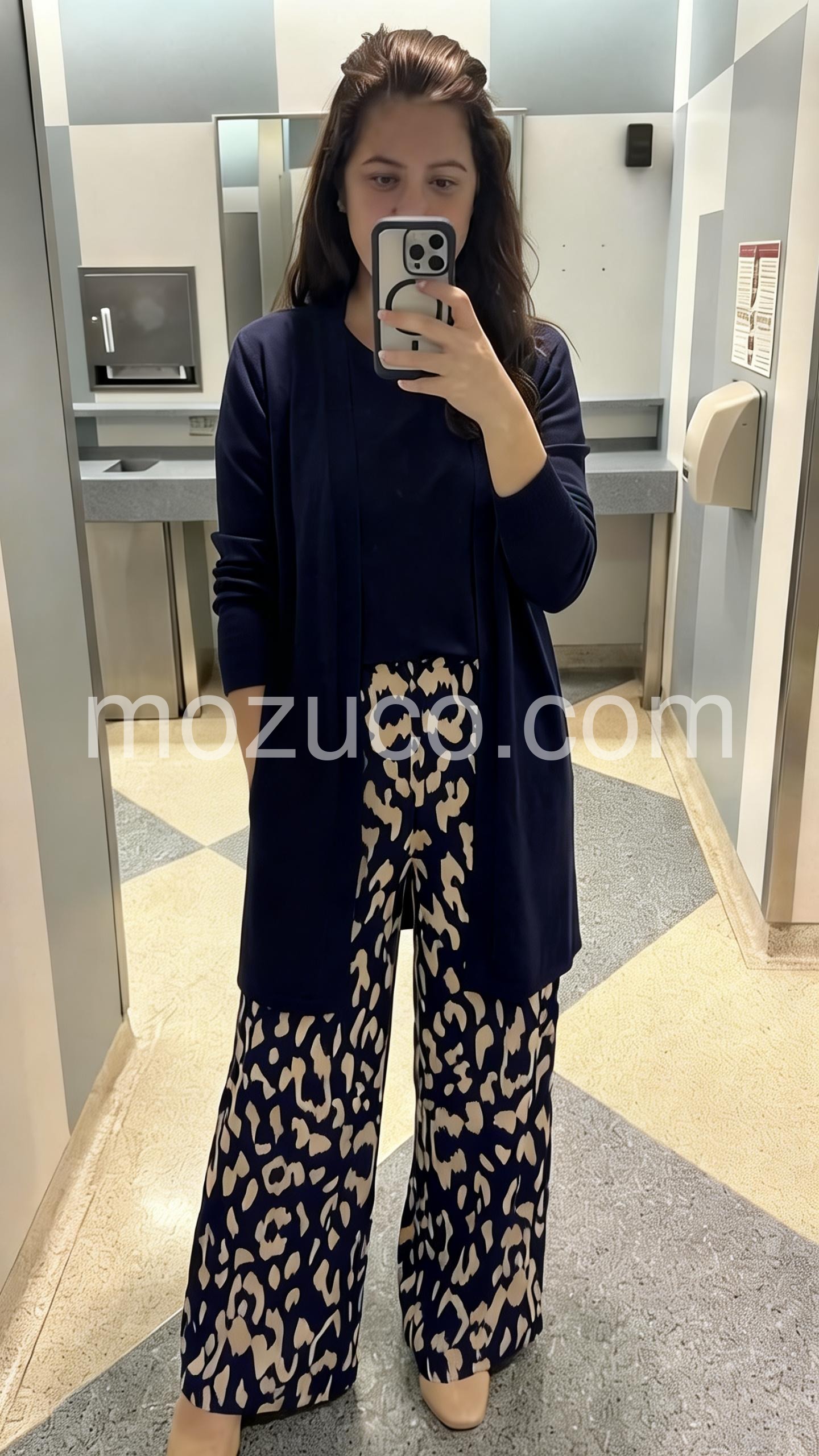 This coordinated outfit features wide-leg pants in a striking navy and cream leopard print. Paired with a matching long cardigan and solid top for a polished look. The relaxed fit offers comfort and style. Perfect for casual outings or stylish events. Effortlessly chic with a modern edge.