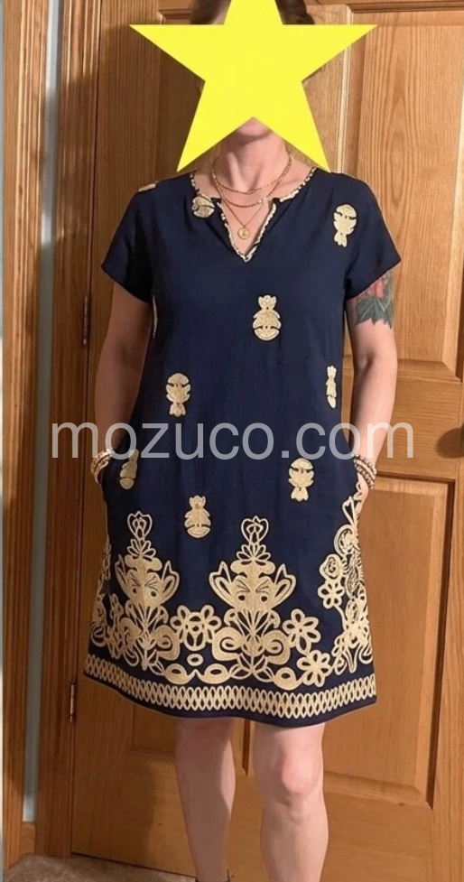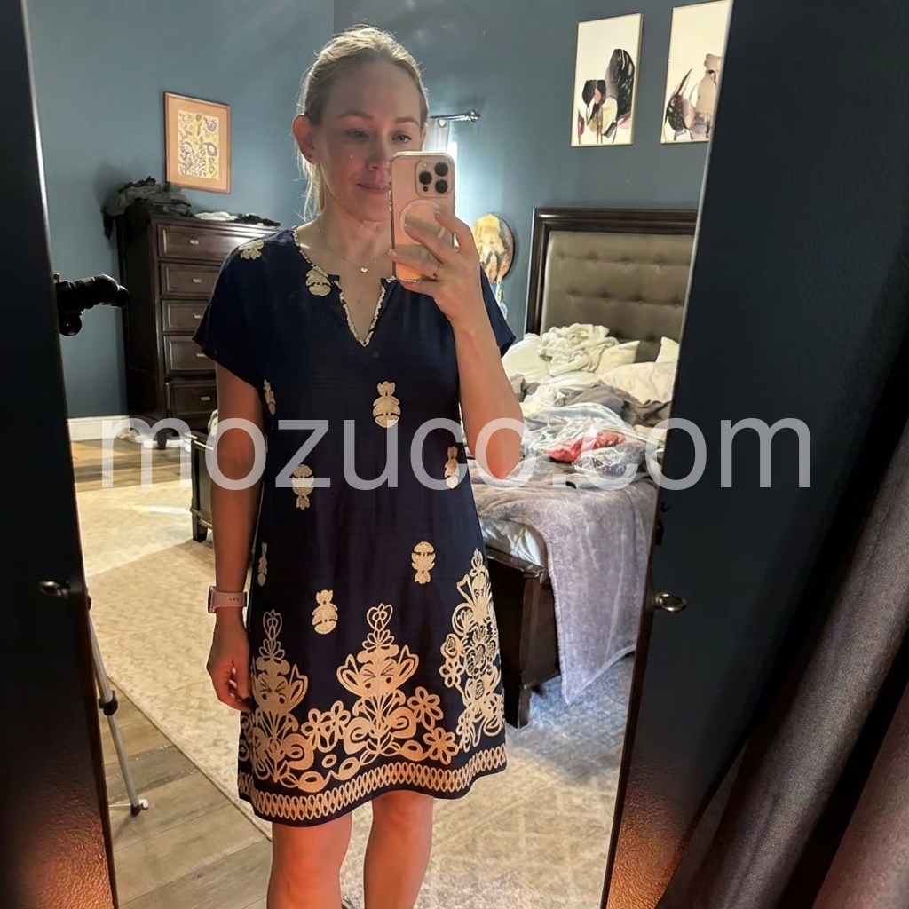 Love this dress! The navy blue with the tan print looks so classy. It is a great shift dress that does not cling to your stomach. Perfect for a hot summer day.