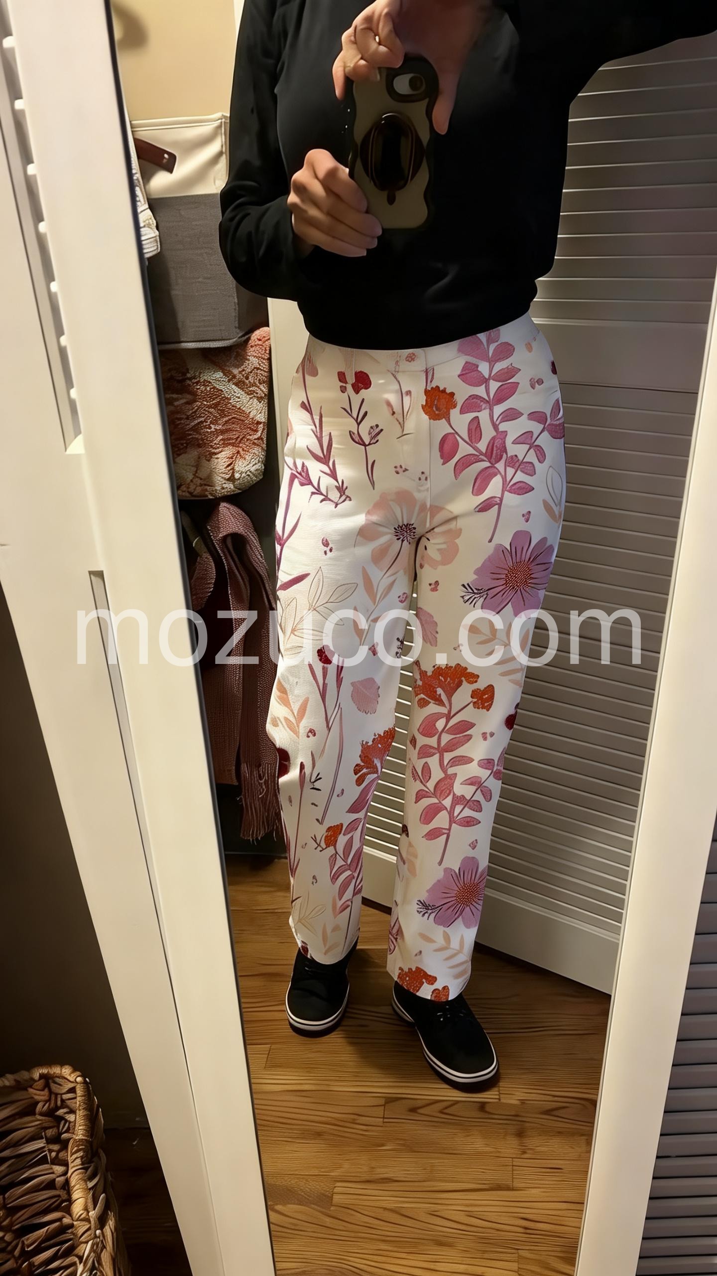 The floral pattern is so beautiful in person. They fit true to size and are incredibly comfortable for running errands or just lounging around the house. The material feels great against the skin.