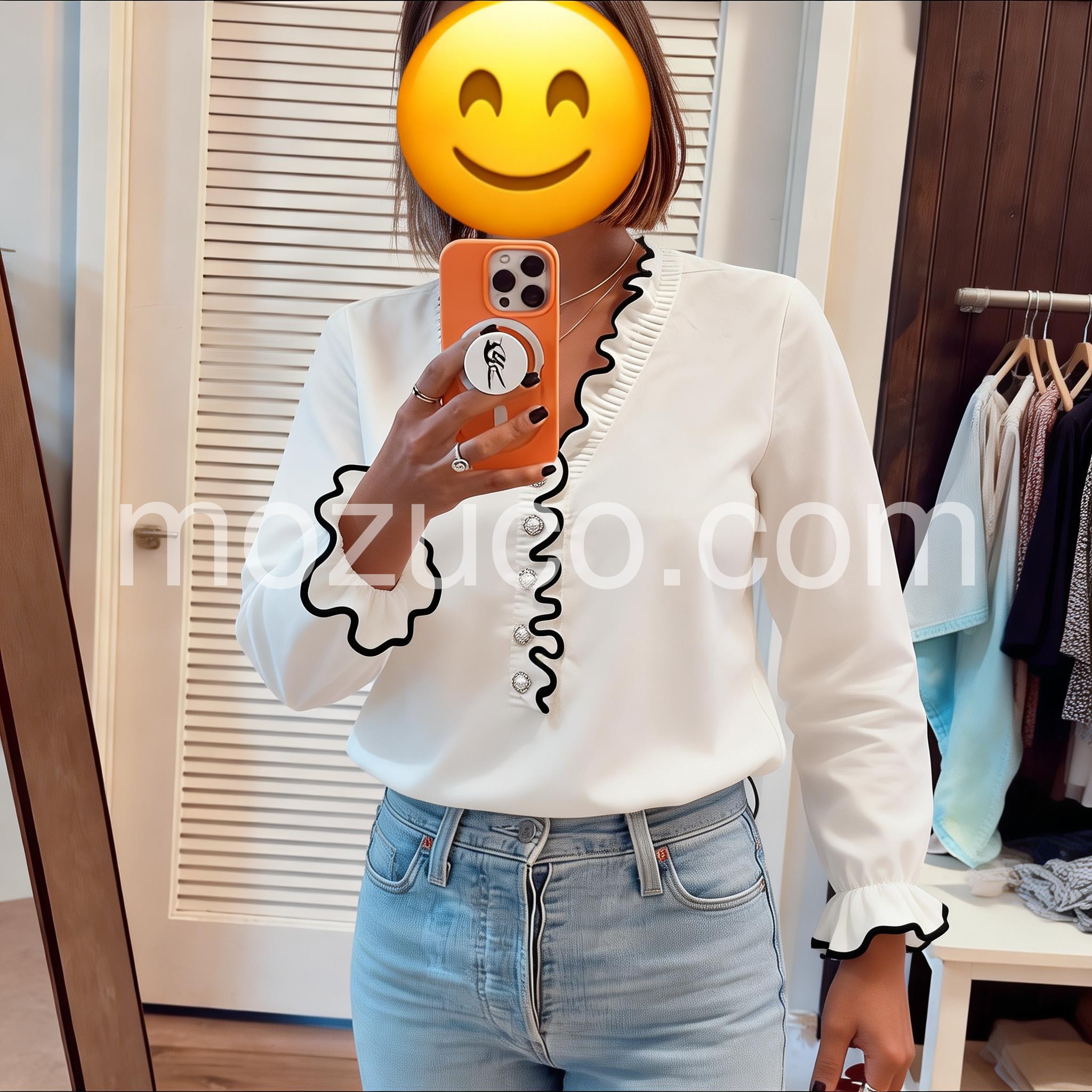 Beautiful top for work or a nice dinner out. The pearl-like buttons add such an elegant touch, and the scalloped edges really make it stand out. I received so many compliments the first day I wore it.