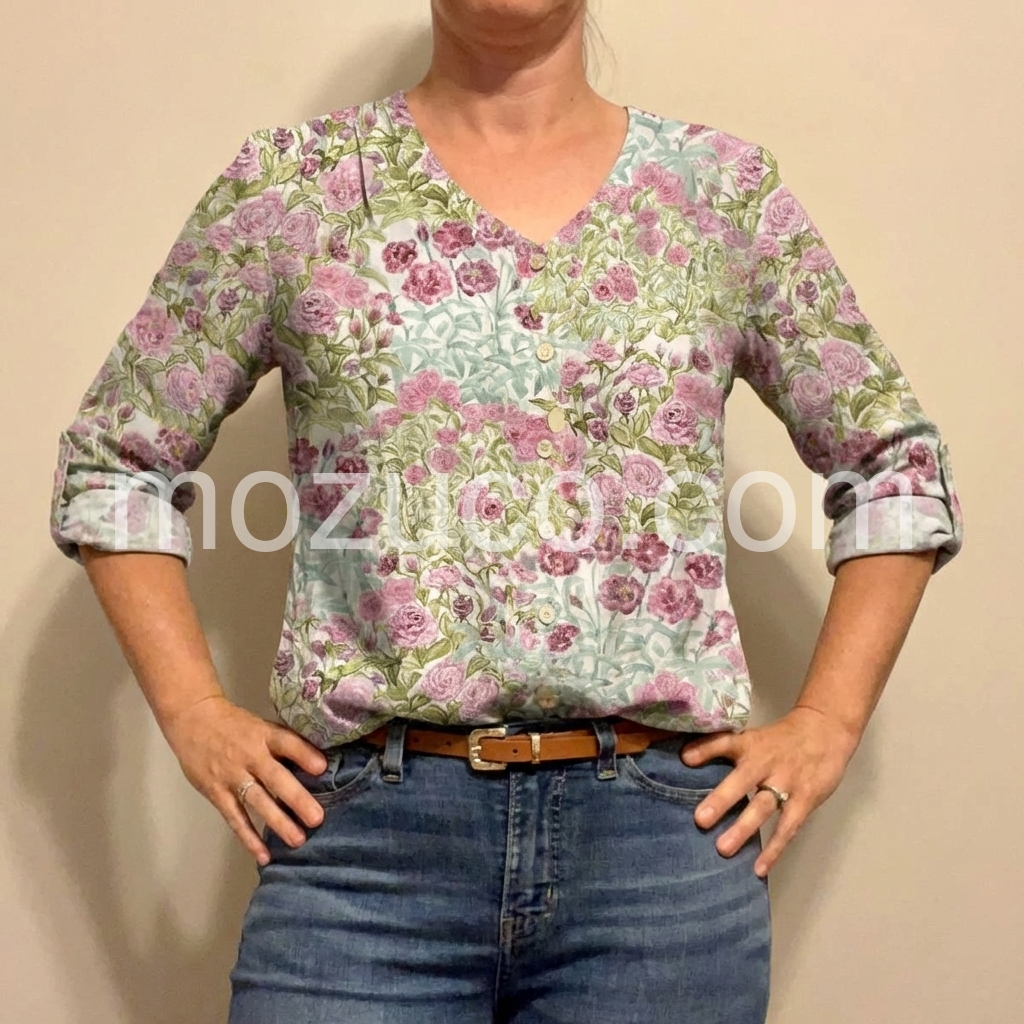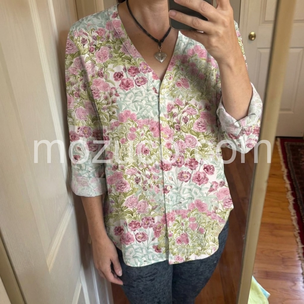 This blouse is incredibly versatile. I can wear it to work with slacks or dress it down for the weekend. The pink roses are gorgeous and the colors are vibrant.