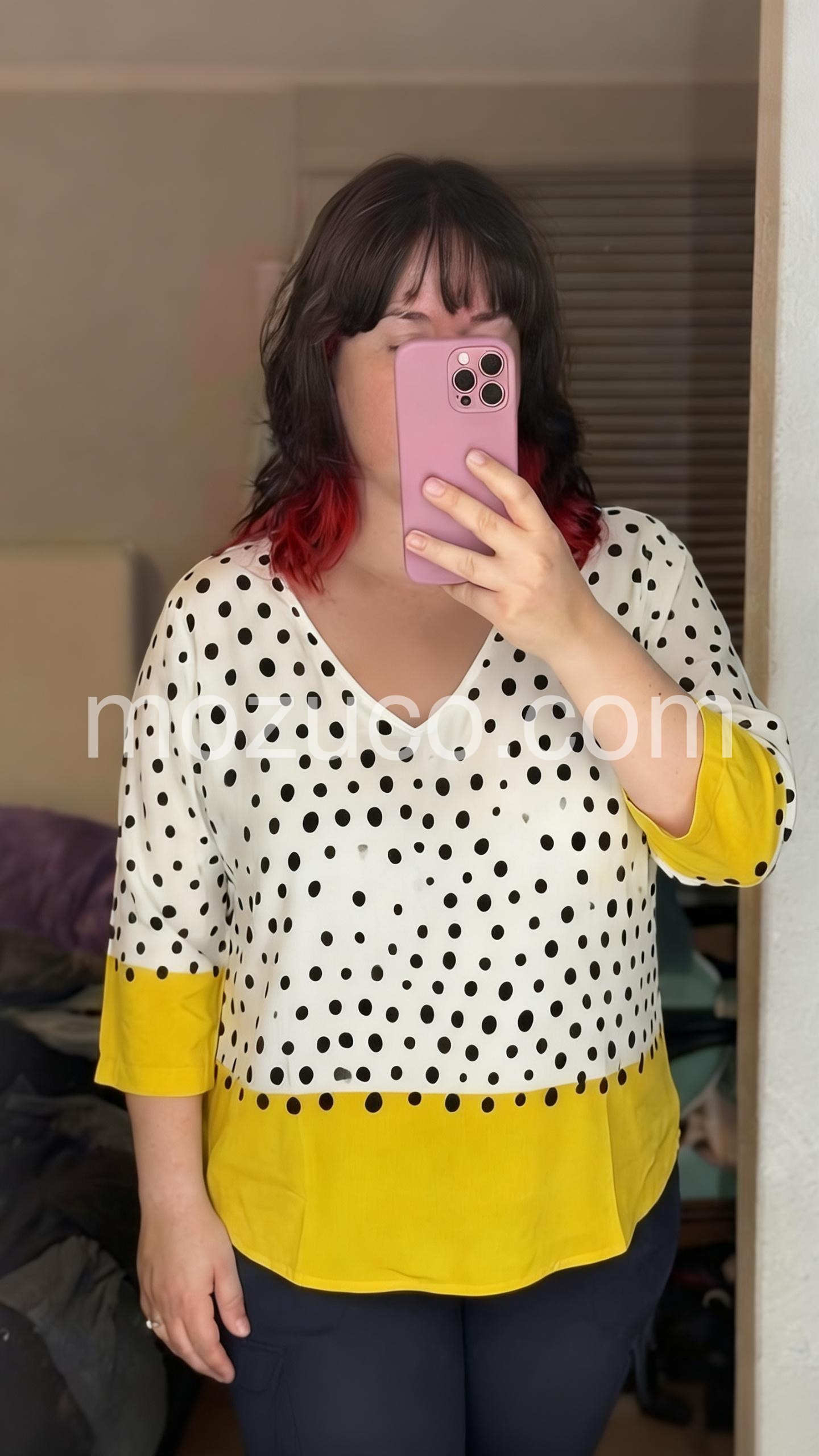 Perfect casual top. It is loose enough to be comfortable all day but still gives a nice shape. The color combination is striking. Five stars from me!