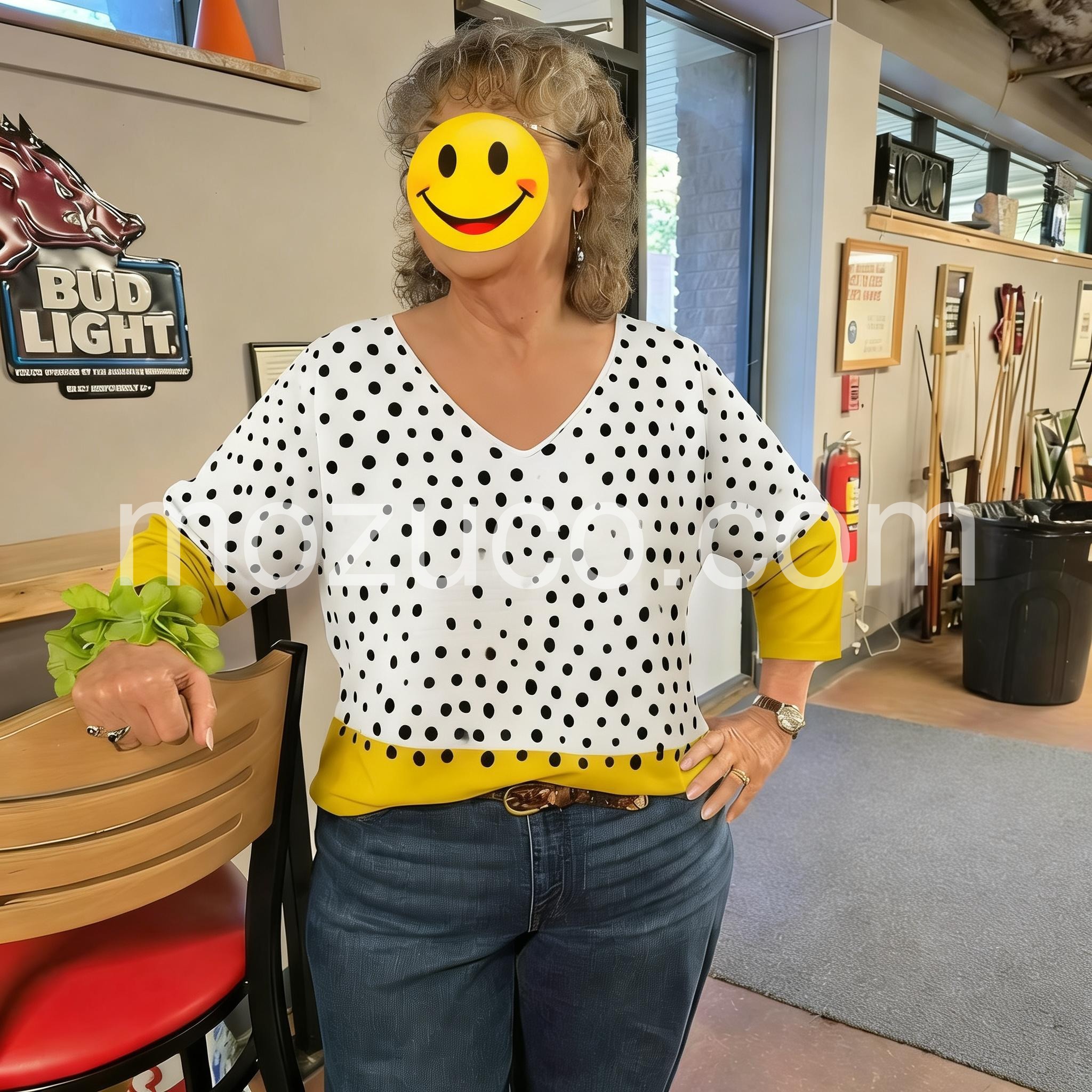 Very flattering V-neck blouse. The fabric is lightweight and breathable, making it perfect for spring and summer. The sleeves are exactly what I was looking for. Highly recommend!
