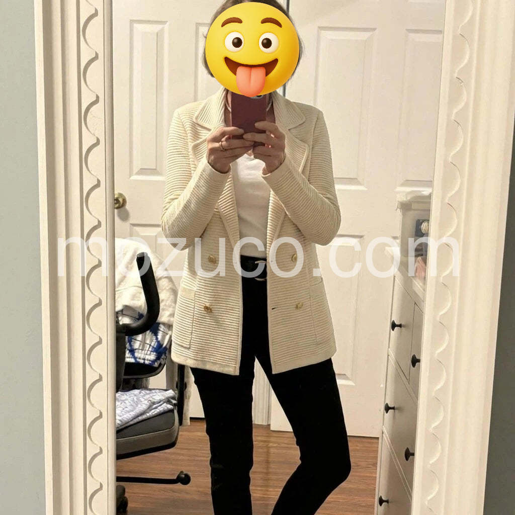 Very impressed with the quality of this sweater. It feels heavy and well-made, not flimsy at all. The double-breasted design is super trendy right now.