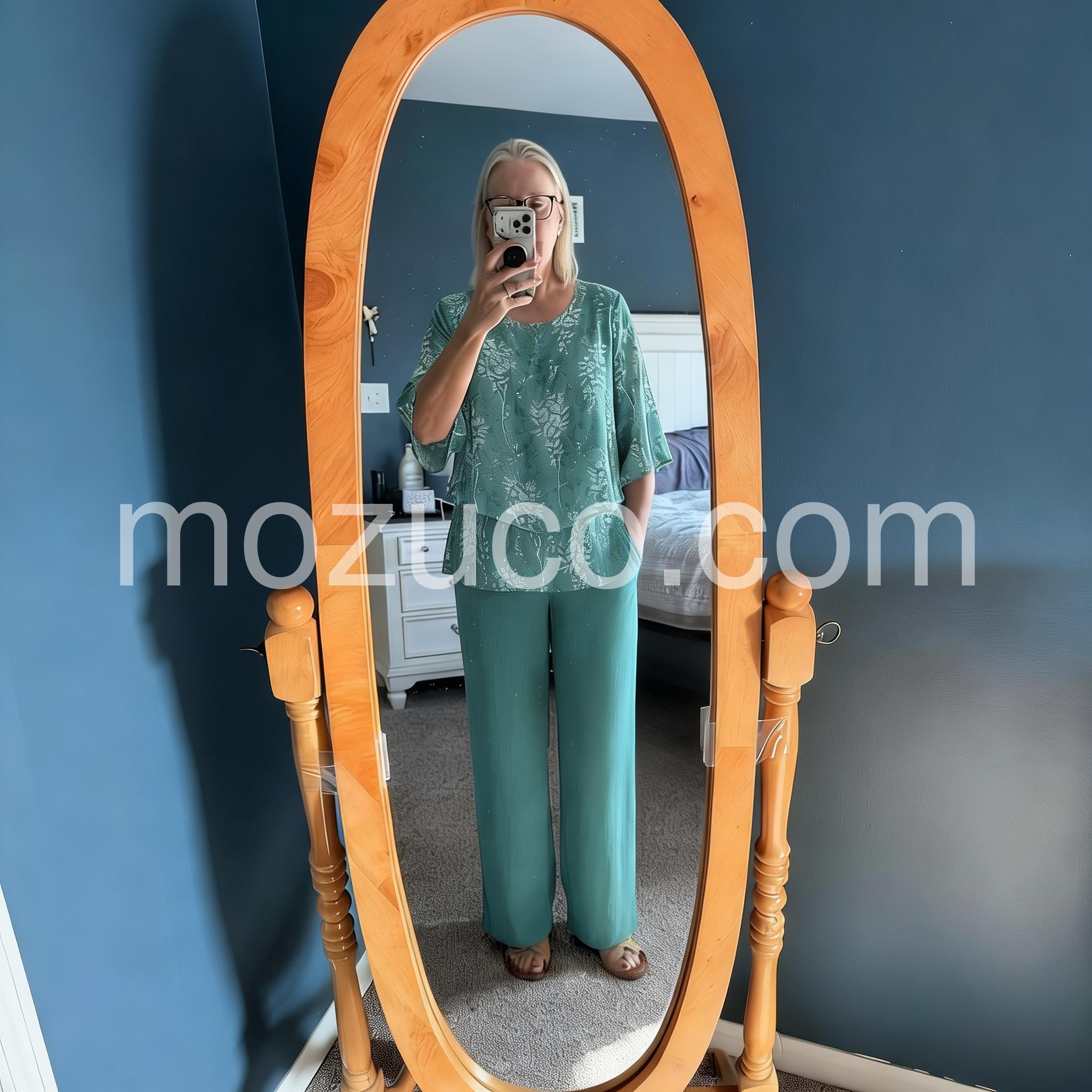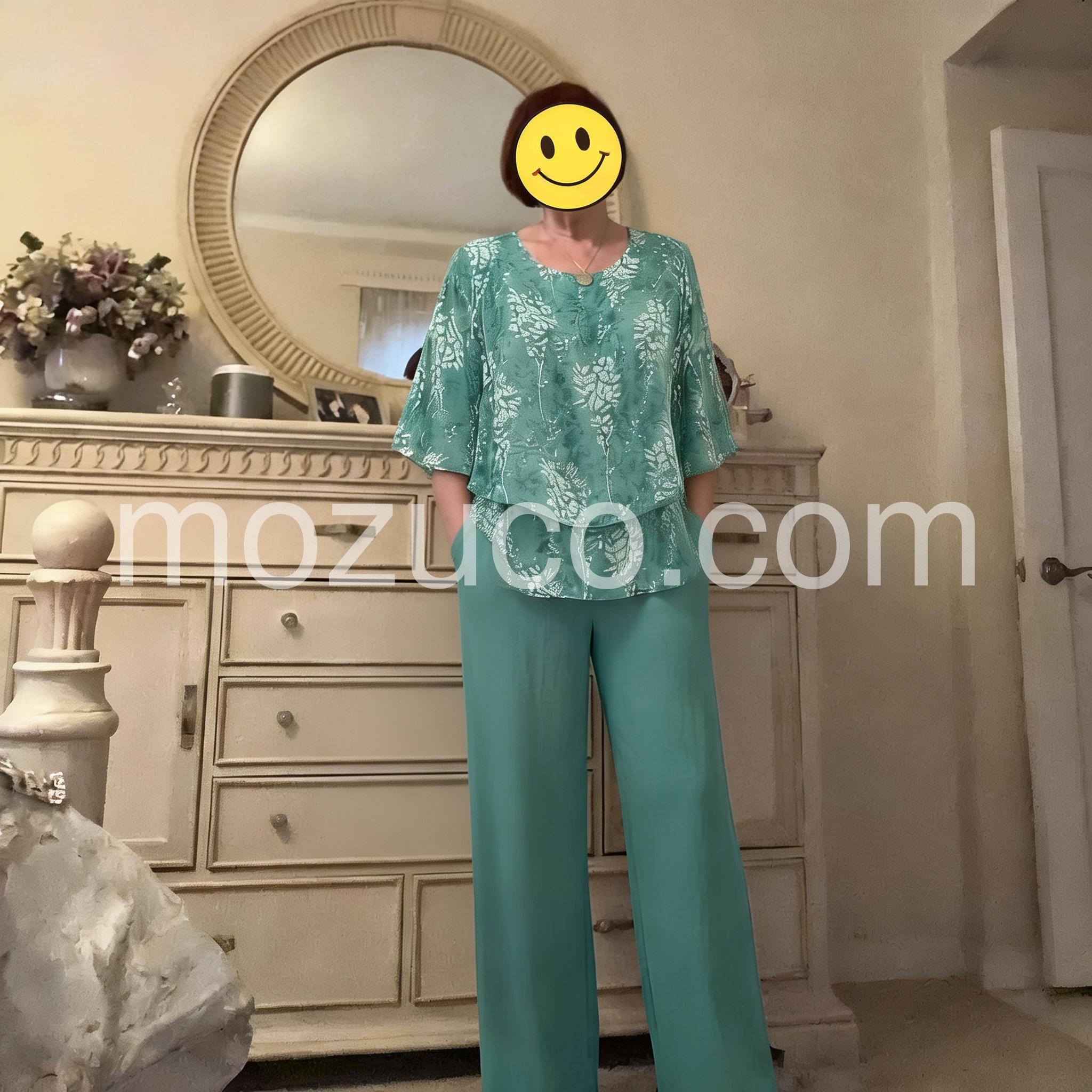 It is hard to find stylish, modest, and comfortable clothing but this set checks all the boxes. The floral pattern is delicate and the solid pants balance it perfectly. It is my new go to outfit for church and luncheons.