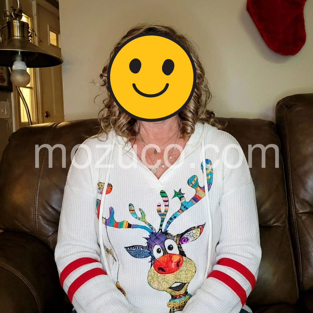 Bring in the winter season with this holiday-ready reindeer top. A white cozy ribbed top with red stripes and colorful reindeer print make this hoodie a cheerful complement to your day or night with its relaxed vibe. A plunging v-neck and buttons on the front give it the perfect amount of detail and chic fit.