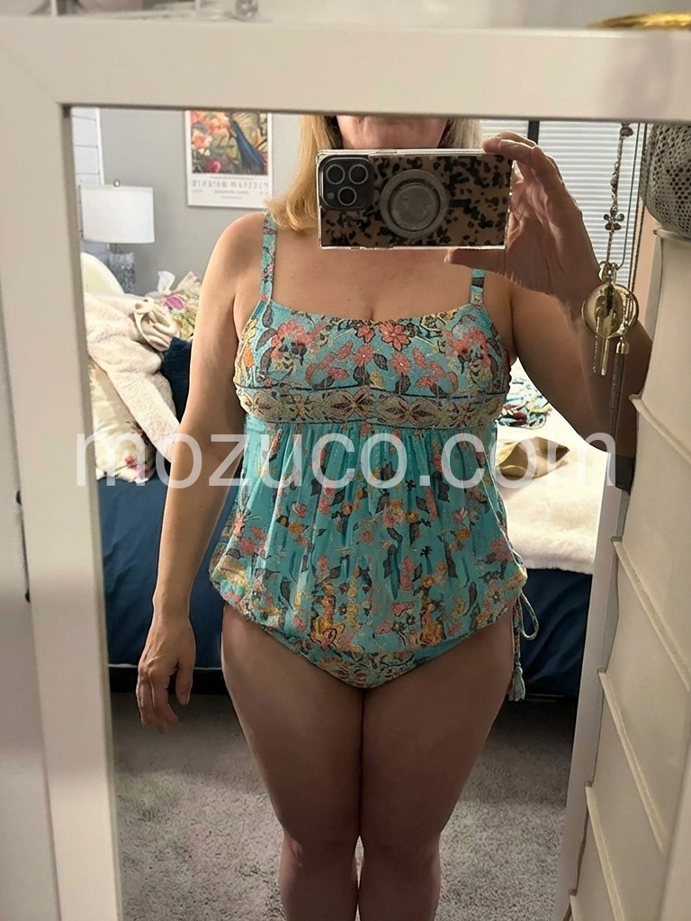 5'5 150lbs 70 year old Medium Bathing suit ... great material, hides stomach area well with style