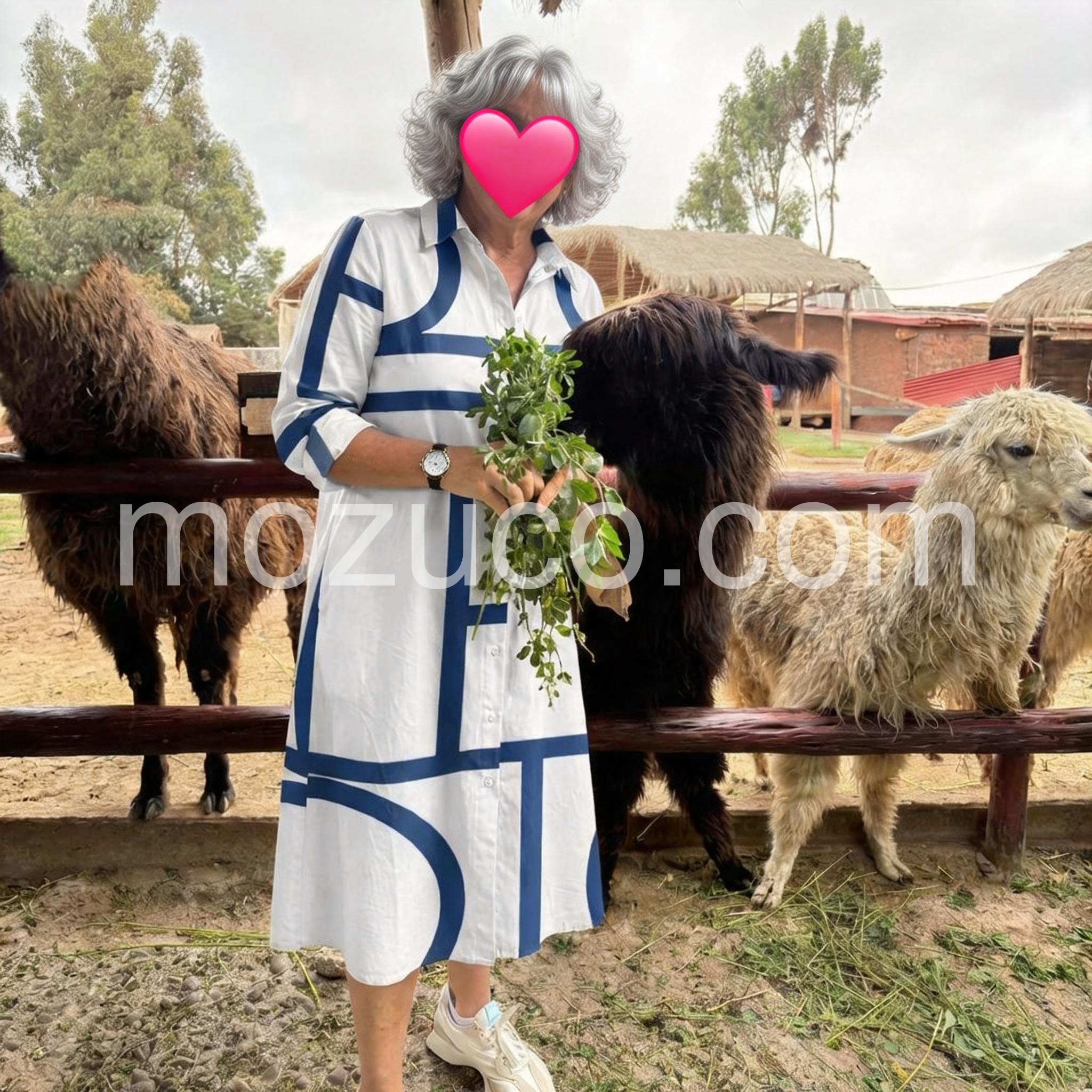 This is the most comfortable dress yet. The blue and white abstract lines on a collared, button-down design give it a creative flair. The material is breathable and lightweight, yet machine washable. It fits true to size, though you can size up to wear it as a stylish duster coat. The stitching is solid, and the dress has a beautiful flow. Whether for business or casual wear, this is ultimately a fantastic piece.