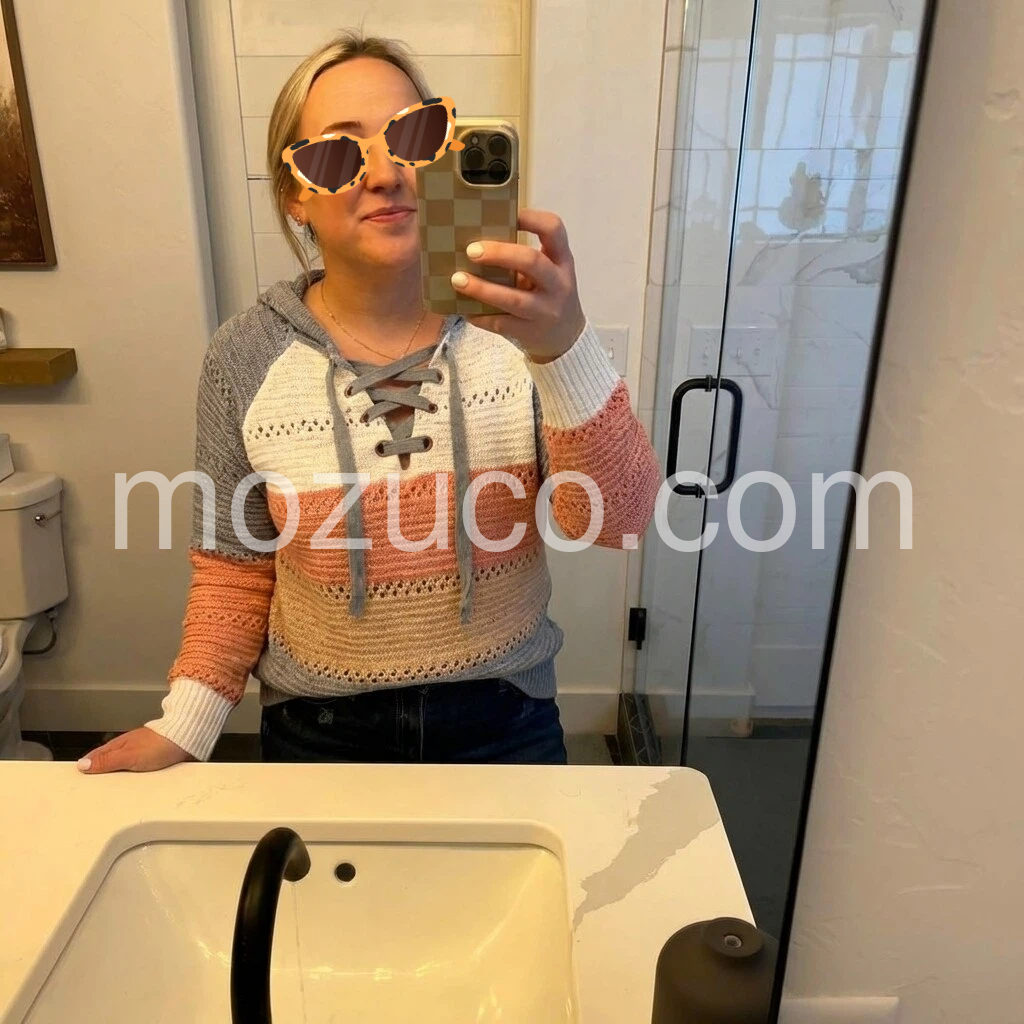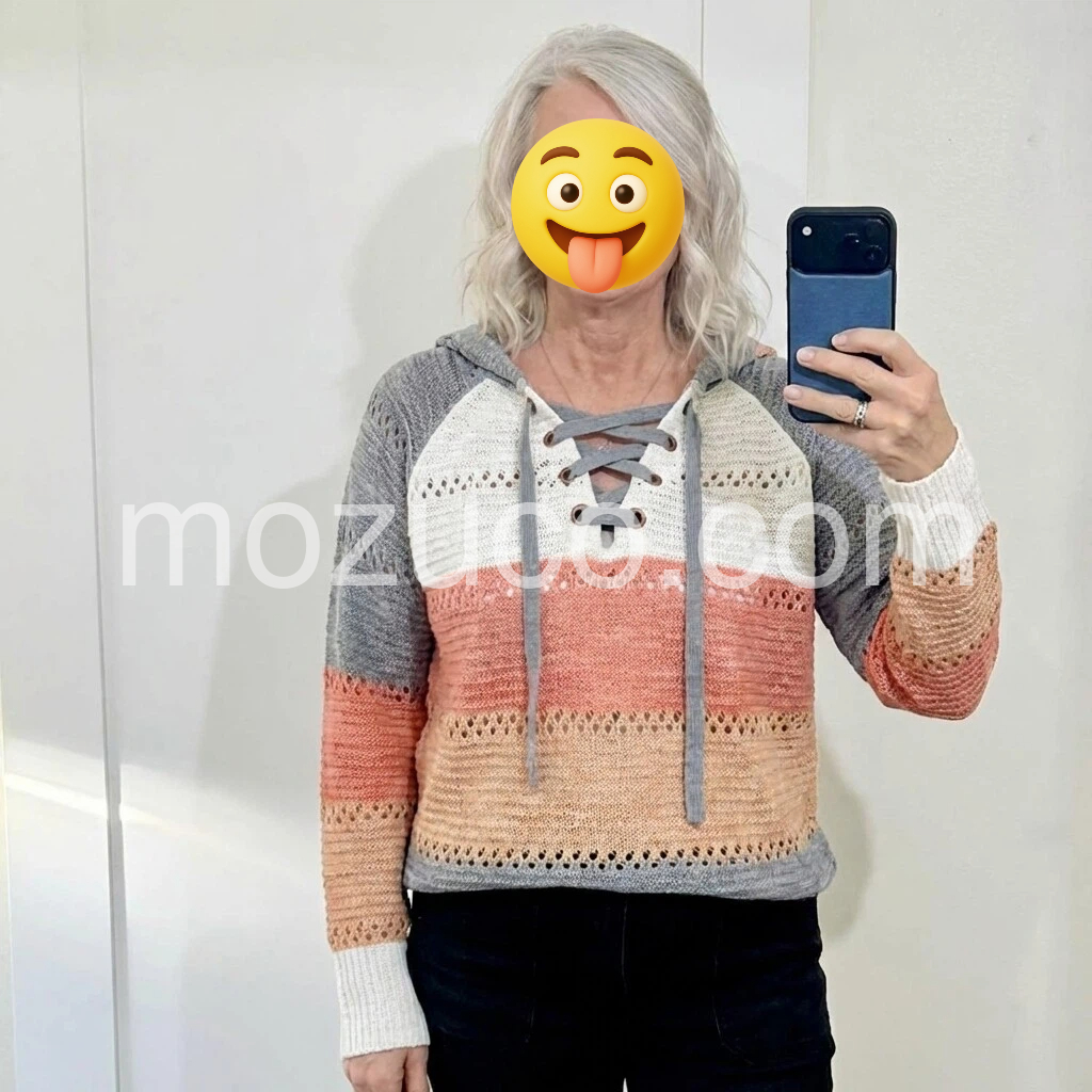 Time to get cozy with this casual knitted hoodie Horizontal gray, white, orange, and tangerine colors highlight any outfit with vibrant to neutral shades. An oversized caged drawstring hoodie and long sleeves give this waist-length sweater an extra laid-back look, perfect for pairing with jeans or a denim skirt.