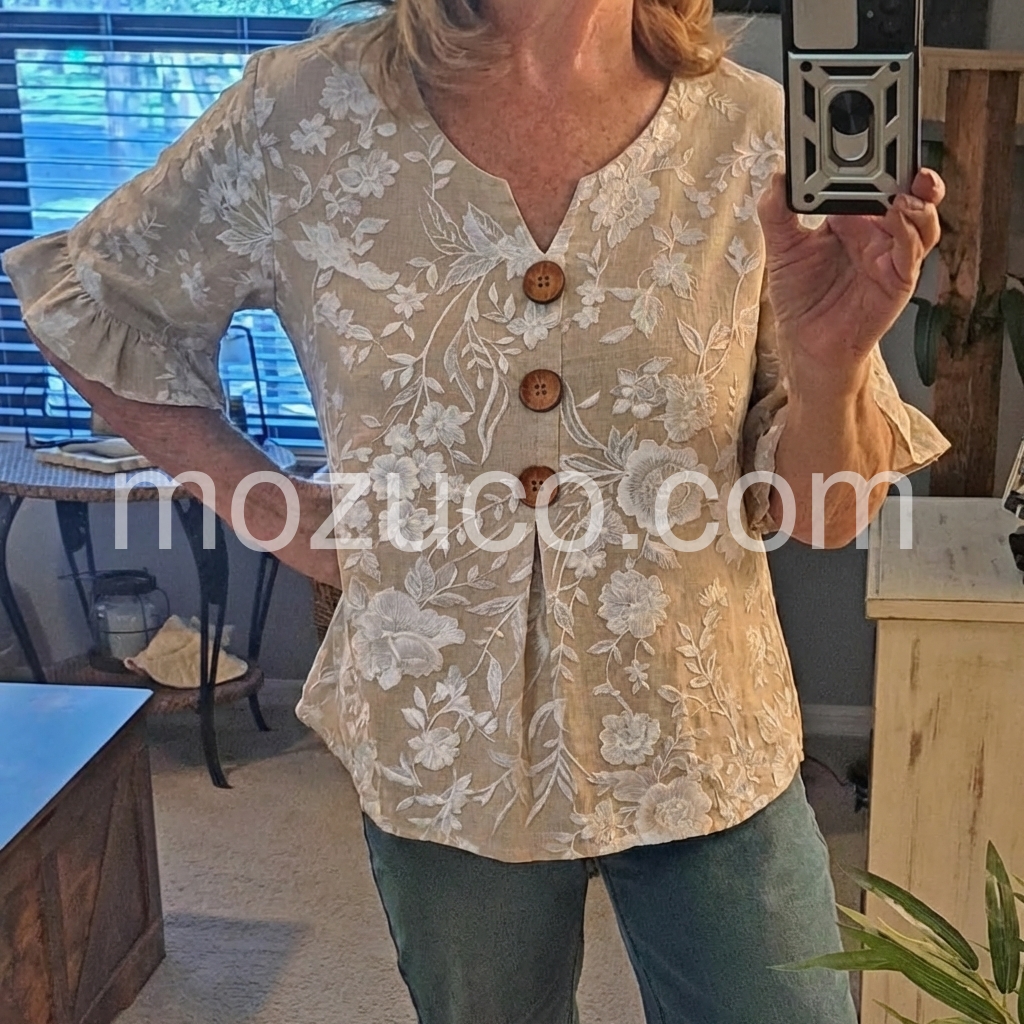 I absolutely love this top! The material feels very breathable, almost like a linen blend, perfect for warm weather. The floral pattern is so delicate and pretty.