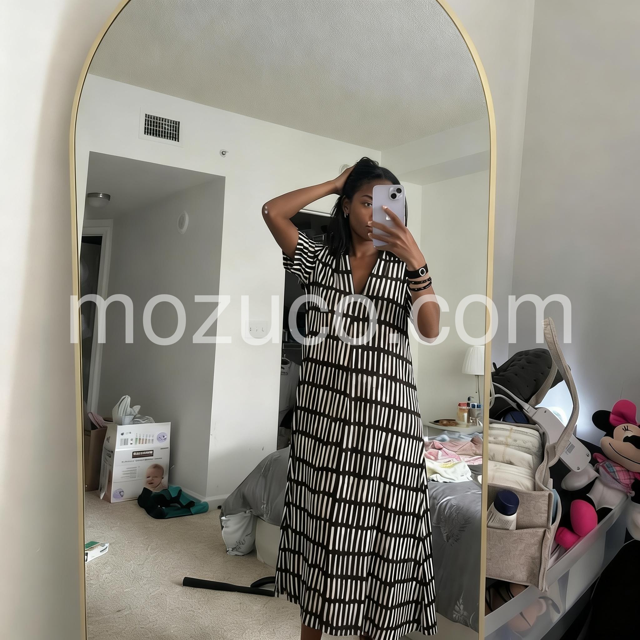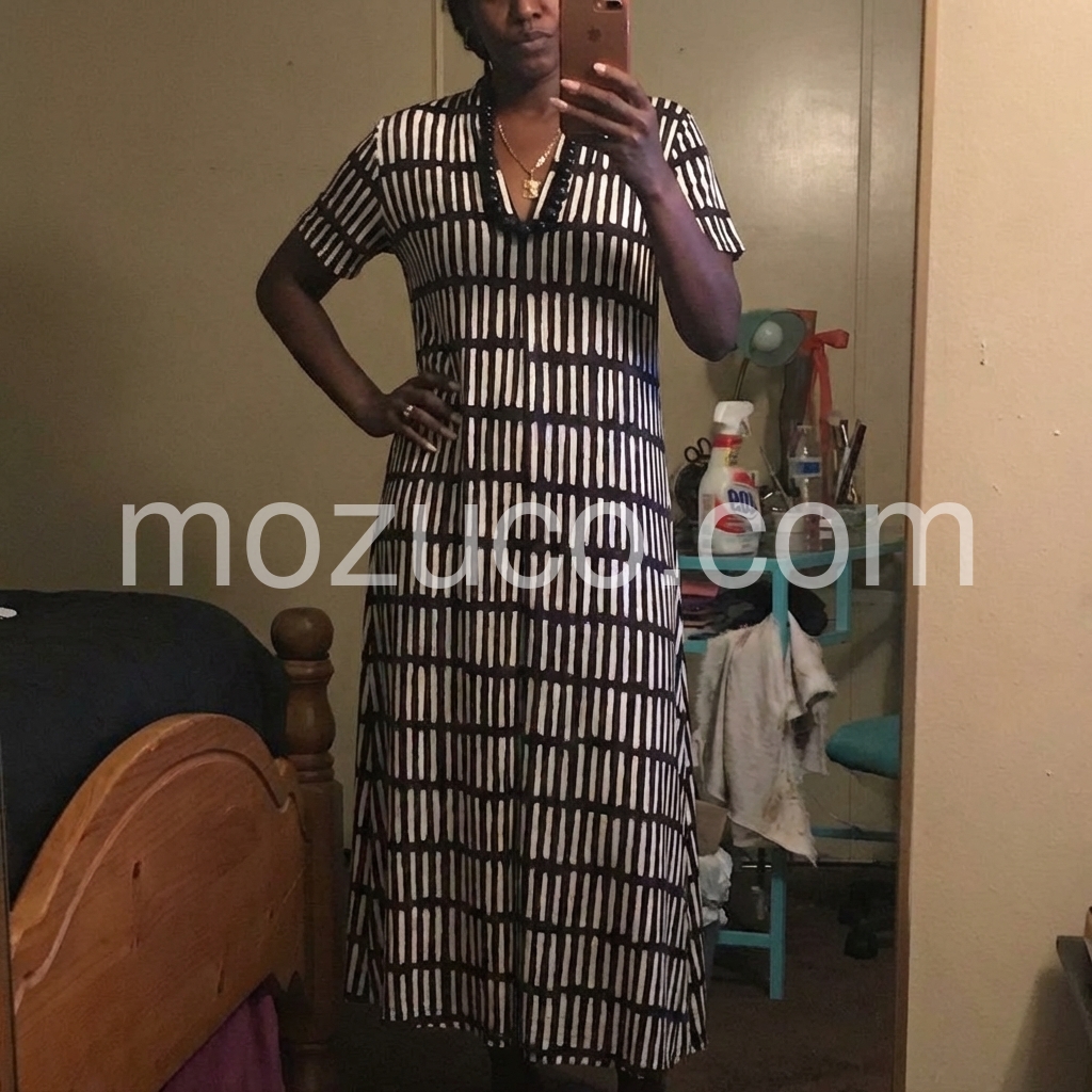 I’m absolutely in love with this dress! The black and white pattern is so stylish and flattering, and the fit feels comfortable and easy to move in. I wore it to a casual get-together and received so many compliments. The length is perfect elegant without being too formal.
