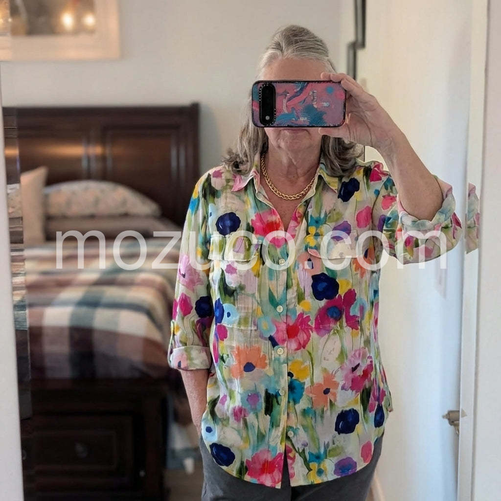 Make a statement in this Vibrant Watercolor Floral Shirt, a lively and artistic blouse that brings bold color and expressive flair to your wardrobe. Crafted from lightweight, fluid fabric—likely silk or satin blend—this long-sleeve button-up features a dynamic watercolor-inspired floral print in rich shades of pink, fuchsia, cobalt blue, emerald green, and sunny yellow, creating a painterly effect that feels both modern and romantic. The classic shirt silhouette includes a collared neckline, front button closure, and two chest pockets that add structure and charm. Rolled sleeves offer a relaxed, effortless look perfect for warm-weather days. Paired here with a shimmering sequin skirt and gold accessories, it effortlessly blends boho elegance with glamor. Ideal for summer outings, beachside dinners, or festive occasions, this floral blouse adds energy, personality, and a touch of artistic flair to any outfit. Let its vibrant hues and fluid design turn heads wherever you go.
