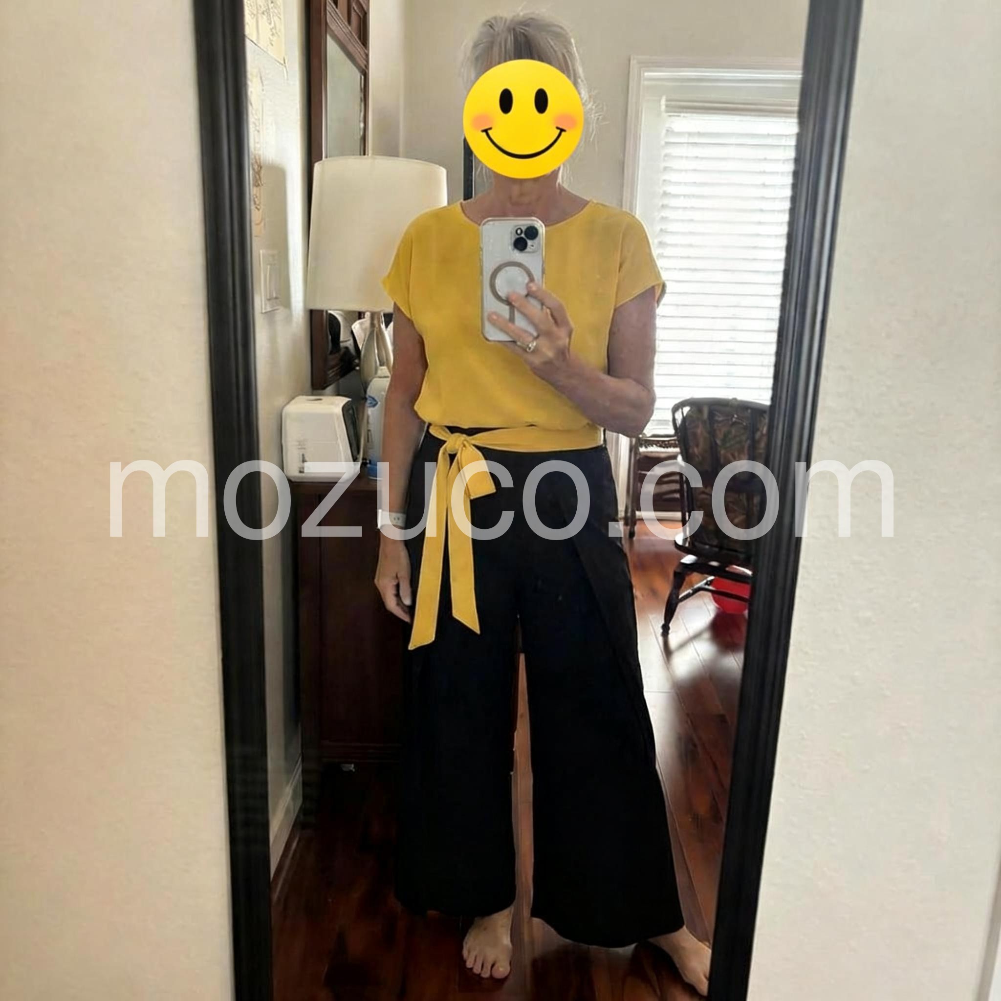 Love the bold color combo! The mustard-yellow top is airy and flattering, and the wide-leg black pants with the yellow waist tie create a chic, modern silhouette. Perfect for casual days out.