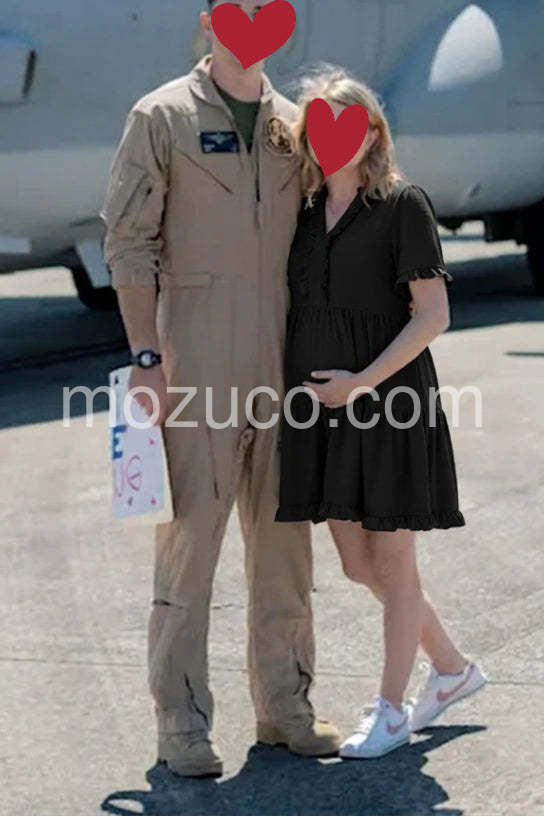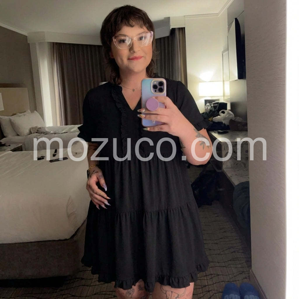 This black dress is so comfortable and flowy. I love the ruffle details around the v-neck. It fits perfectly and hides my tummy.